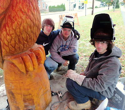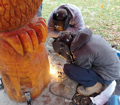| Several of our Assabet Metal Fabrication students packed up their shop tools, a welding machine, and a electrical powered generator to secure a wooden sculpture in place on Hudson's new bike path. The town of Hudson, Massachusetts has laid the ground work and established several concrete foundations for developing several wooden sculptures along it's new bicycle path. |