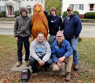 | Several of our Assabet Metal Fabrication students packed up their shop tools, a welding machine, and a electrical powered generator to secure a wooden sculpture in place on Hudson's new bike path. The town of Hudson, Massachusetts has laid the ground work and established several concrete foundations for developing several wooden sculptures along it's new bicycle path. |